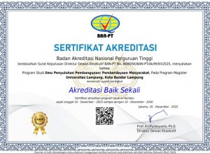 Program Studi Magister (S-2) Ilmu Penyuluhan Pembangunan/Pemberdayaan Masyarakat, Universitas Lampung, kembali menorehkan capaian membanggakan dengan meraih peringkat Akreditasi Baik Sekali dari Badan Akreditasi Nasional Perguruan Tinggi (BAN-PT).