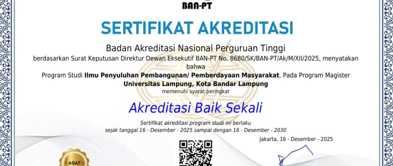 Program Studi Magister (S-2) Ilmu Penyuluhan Pembangunan/Pemberdayaan Masyarakat, Universitas Lampung, kembali menorehkan capaian membanggakan dengan meraih peringkat Akreditasi Baik Sekali dari Badan Akreditasi Nasional Perguruan Tinggi (BAN-PT). Pencapaian ini tertuang dalam Surat Keputusan Direktur Dewan Eksekutif BAN-PT Nomor 8680/SK/BAN-PT/Ak/M/XII/2025 tentang Peringkat Akreditasi Program Studi Ilmu …